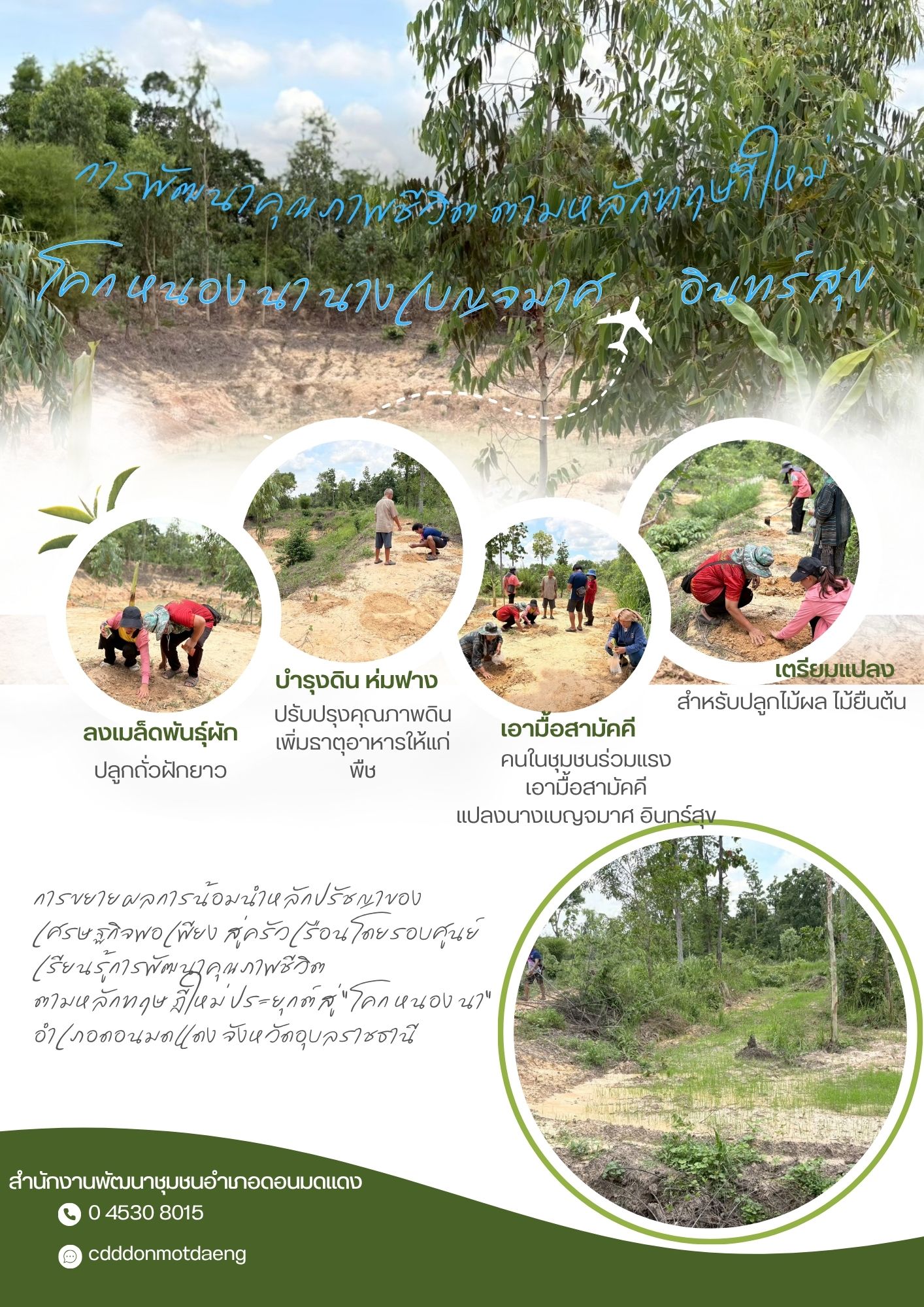 ตามหลักทฤษฎีใหม่ ประยุกต์สู่ “โคก หนอง นางเบญจมาศ อินทร์สุข บ้านยางกระเดา หมู่ที่ 10 ต.ท่าเมือง อ.ดอนมดแดง จ.อุบลราชธานี